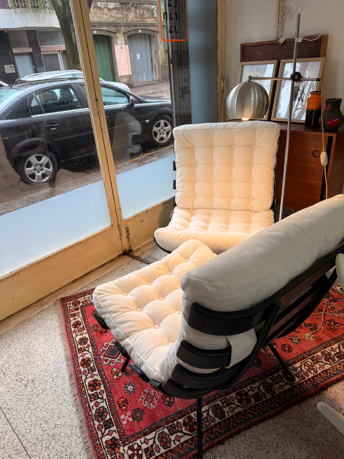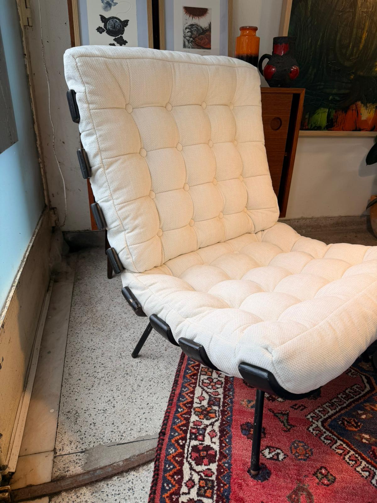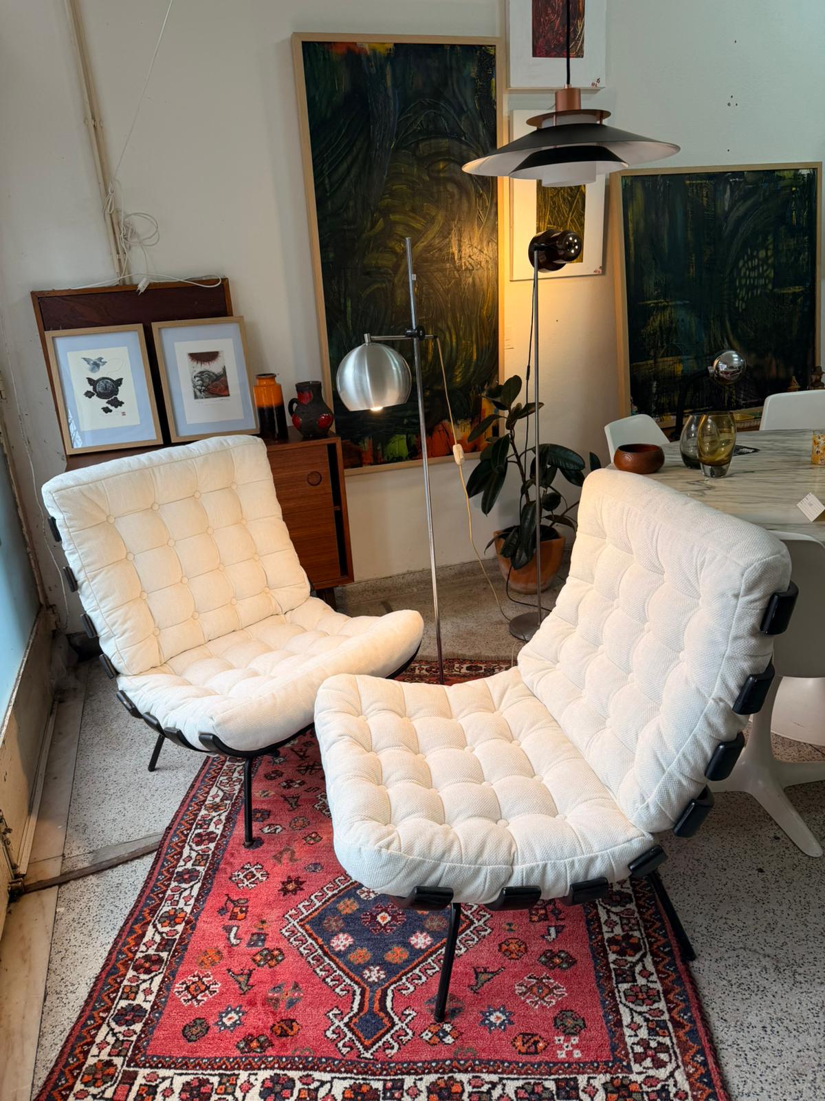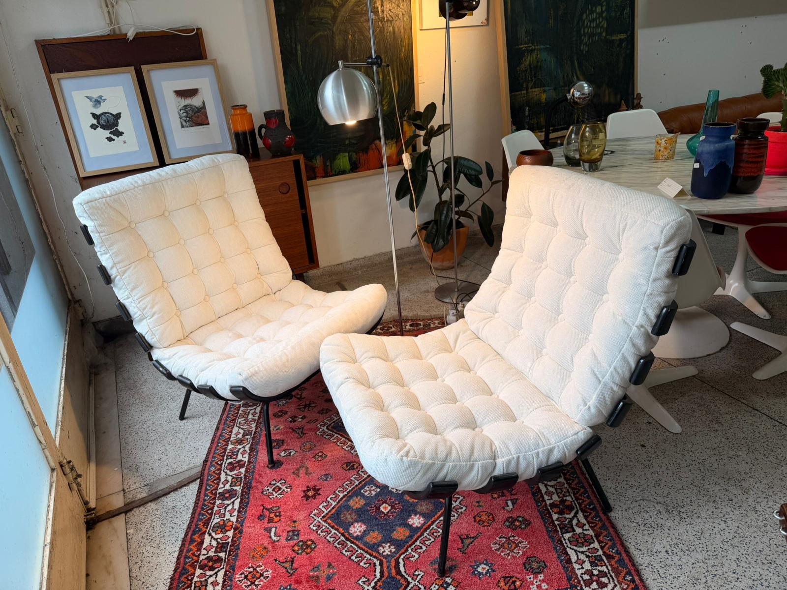 The chairs feature a black lacquered metal frame supporting a series of characteristic horizontal brackets that cradle the generously padded cushions. Upholstered in a tufted off-white fabric, the cushions provide a striking contrast to the dark frame while enhancing the chair’s soft, lounge-oriented silhouette. The low seating position and ergonomic proportions make the Costela chair both visually powerful and deeply comfortable.